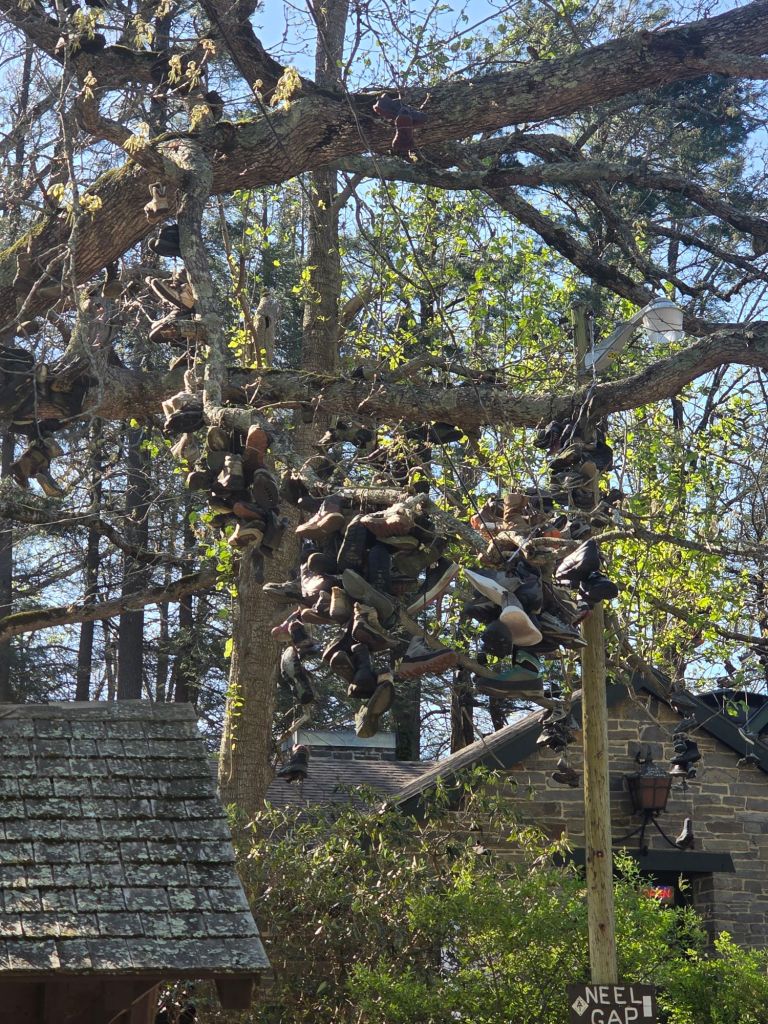 I then continued on the trail summiting Blood Mountain, and eventually making it to Mountain Crossings and of course got a picture / video of the tree where hikers who get off trail throw their sneakers in the tree. I then checked in and where got my resupply box, and Peter and I split a frozen pizza that they offer.